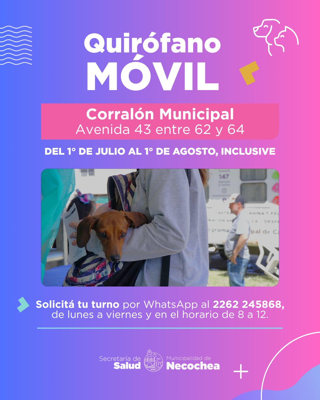 Para solicitar turnos, los interesados se podrán comunicar por WhatsApp al 2262-245868, de lunes a viernes y en el horario de 8 a 12. A la hora de solicitarlo, deberán dejar constancia de su nombre y apellido, número de DNI, dirección, edad de la mascota, especie y sexo.