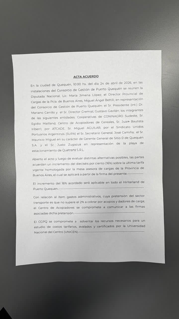 Luego de evaluar distintas alternativas, las partes acordaron un incremento del 16% sobre la última tarifa vigente homologada por la Mesa Asesora de Cargas de la Provincia de Buenos Aires. El aumento comenzará a aplicarse desde la firma y tendrá alcance en todo el hinterland de Puerto Quequén.